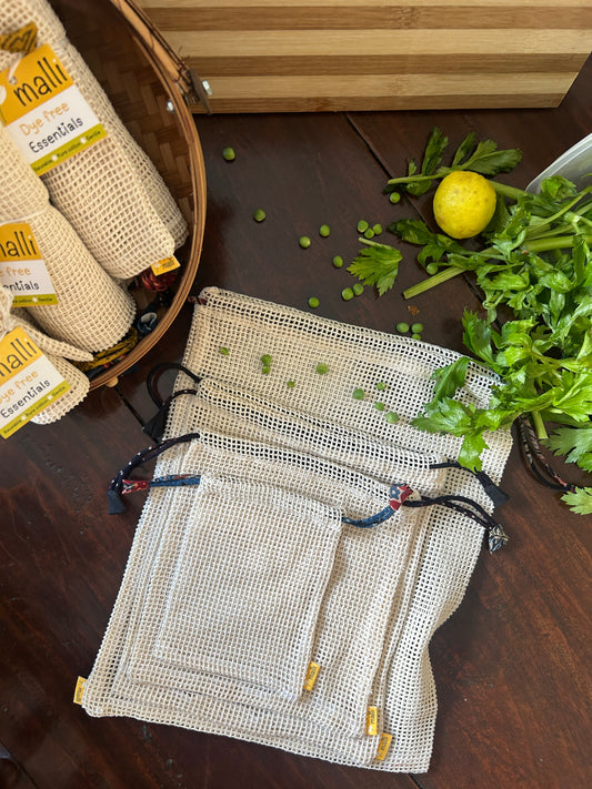 Unbleached Cotton Mesh Produce Bags (Set of 4) | Sustainable S-XL Fruit & Vegetable Bags with Naturally Dyed Drawstrings
