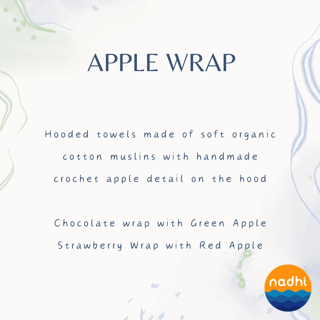 Hooded towels made of soft organic cotton natural dye muslins with handmade crochet apple detail on the hood. Can be used up to 2 years. Use to wrap the baby right after a warm bath or carry the little one outdoors safely